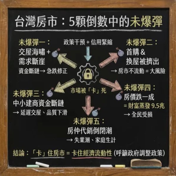 台灣房市持續低迷,房仲全國聯合會理事長王瑞祺示警: 「當前房市已不只是景氣循環問題, 而是在長期政策干預與信用緊縮下, 累積出5顆『尚未引爆、卻已開始倒數的未爆彈』。」