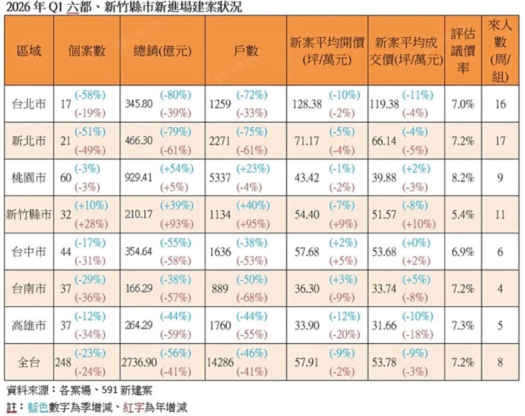 根據591新建案統計,全台六都及新竹開季推案持續萎靡, 進場建案共248件,戶數約1.43 萬戶,總銷金額為2,736.9億元 , 悉數創下單季歷史新低紀錄。 另外,全台平均開價與成交單價分別下修至57.9萬與53.8萬元, 不只雙雙接近兩年前水準,更較上季修正近1成; 雙北、桃園及高雄等縣市無論較上季及去年同期, 開價也紛紛下跌,馬年開局依舊籠罩在低氣壓中。